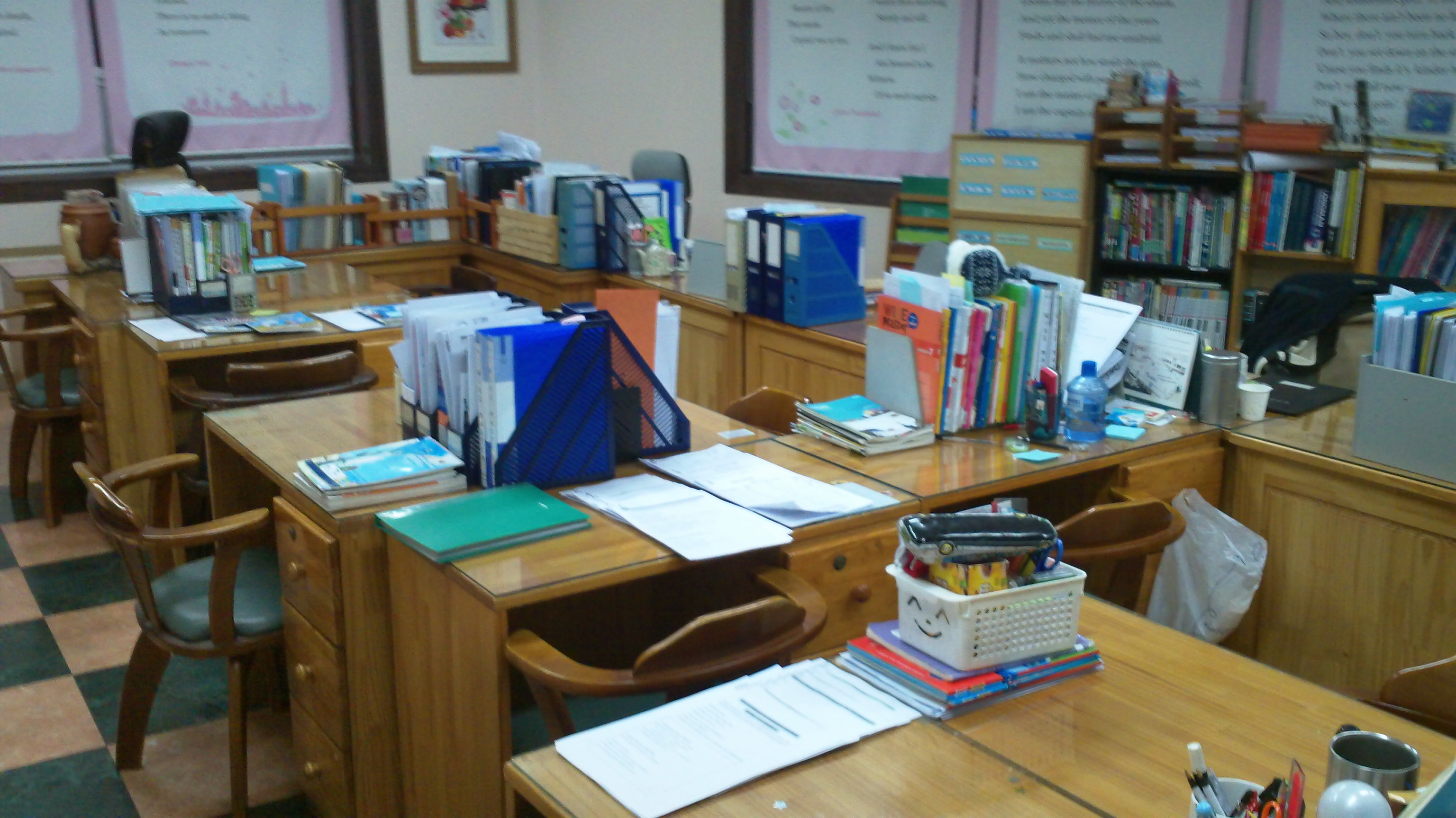 This is the staffroom, my desk is the one at the bottom with the papers on it