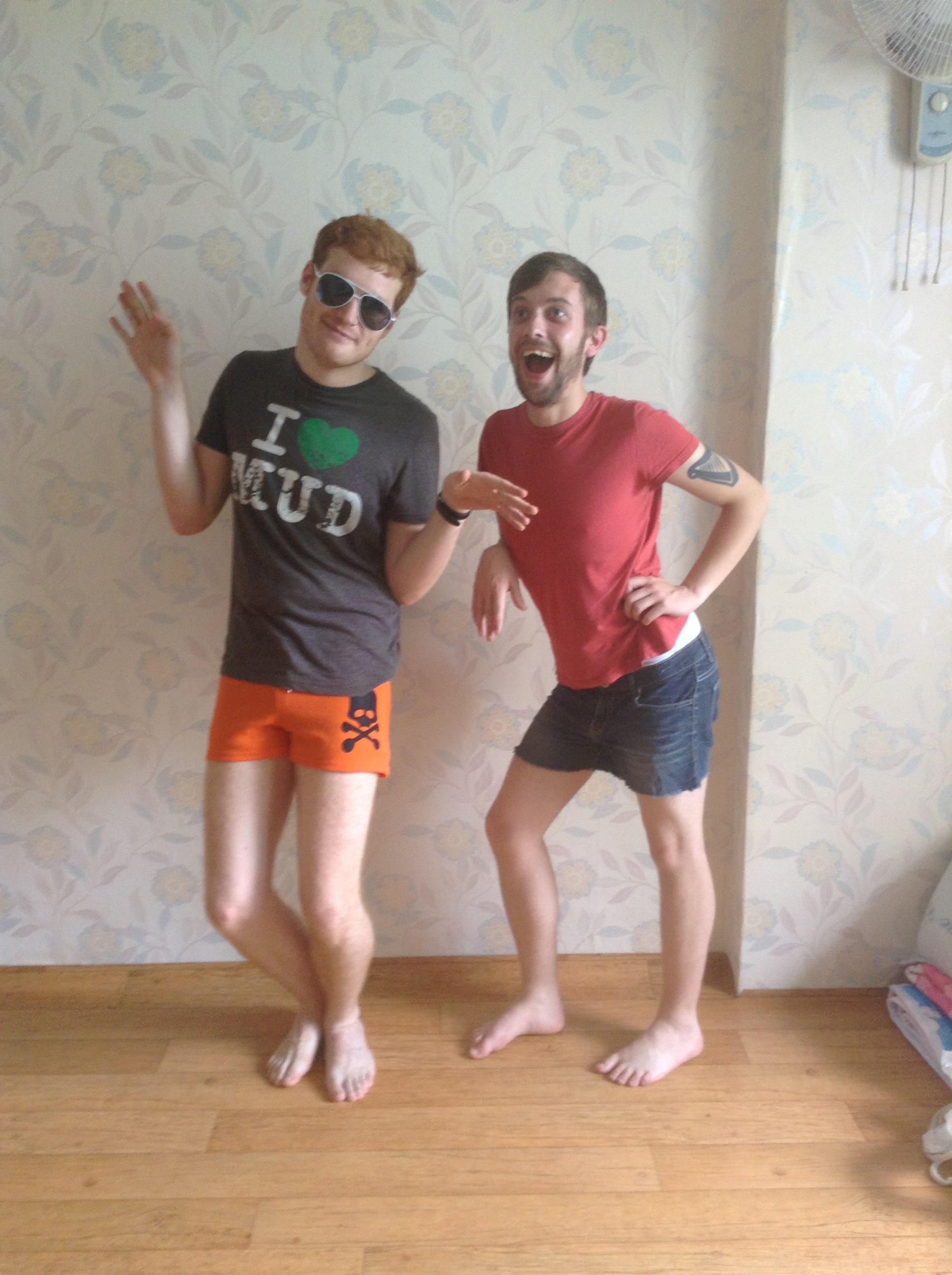 And now after a three hour drive we had reached Boryeong. We found our room for the night (and I do mean room, not beds or furniture, just a floor, a sink and a pile of blankets), and we changed into our mud clothes. I should explain before you look too closely at the photos (might be too late) that the night before, Josh and I had been out drinking in Bupyeong until unwise ‘o’ clock in the morning and when we woke up and got ready, to the tunes of Toots and the Maytals, we were still a little tipsy. We were still a little tipsy as we left the house to meet Mira and decided to find some one-use swimming shorts that we could get muddy and trash afterwards. In our infinite wisdom we decided that price was more important than appearance and left a store with shorts costing only 6000won (about £3.50). Nice. What we had could only be called hot pants. Mine were bright orange with a skull and crossbones logo whilst Josh had gone for bright yellow with a pink logo. At the time we were quite chuffed with our cleverness and money saving smarts. When we got them on, however, we realised that both our shorts and ourselves were about as uncool as it is possible to be. We left the room and were greeted by sunshine and people in gender appropriate clothing.