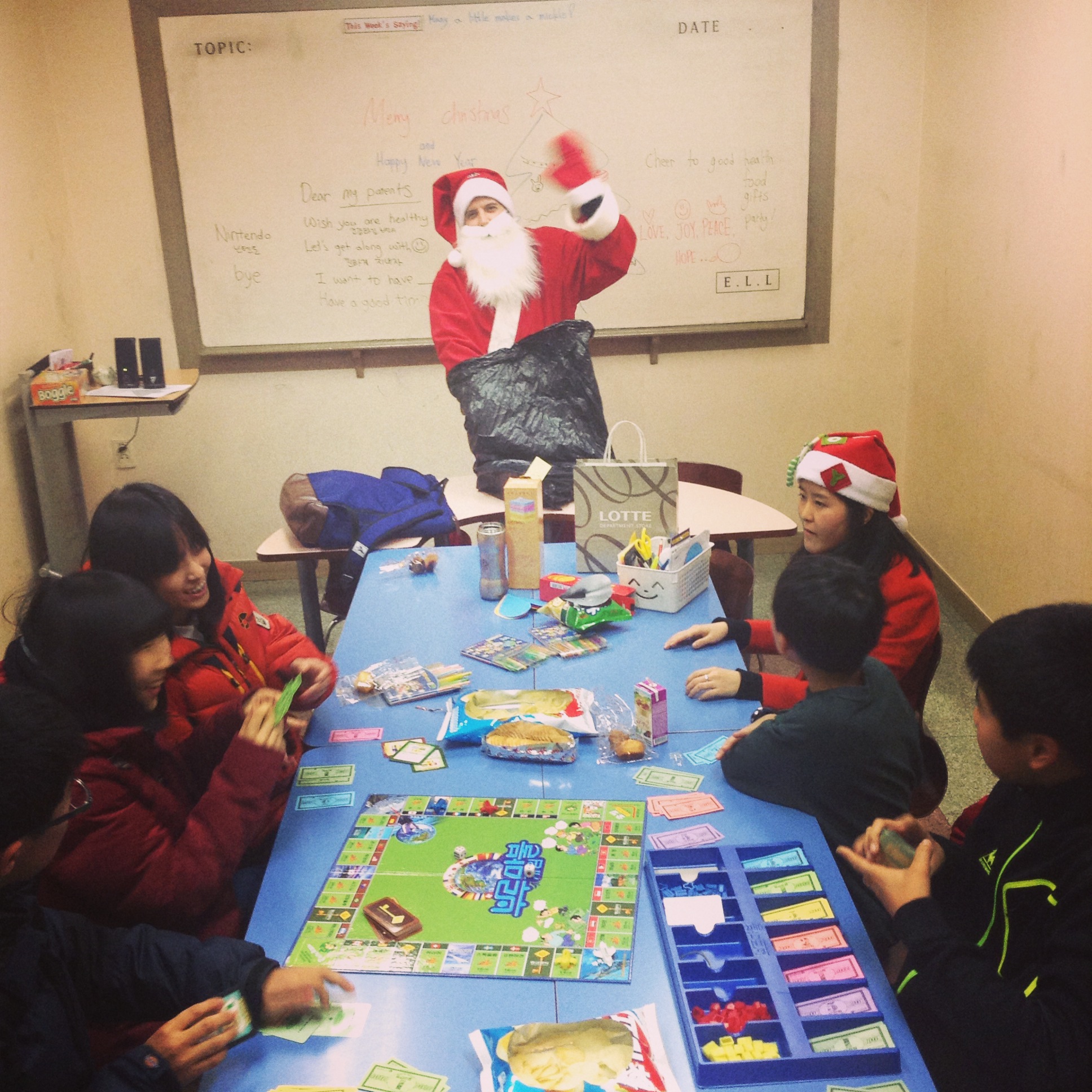 My first shift was at three with some combined classes that each had a few students of mine. I went for the bad Santa style, stealing presents and snacks and only giving up presents in exchange for sweets or crisps. I enjoyed being Santa but I was also glad when it was over. My normal classes were much more fun. We played games, did some colouring in and even played a Korean version of Monopoly, called Blue Marble, in one class. I’m pretty sure the banker was robbing the bank while one of the girls was stealing property cards from other players, badly. Musical chairs was especially good, if a little hectic.
