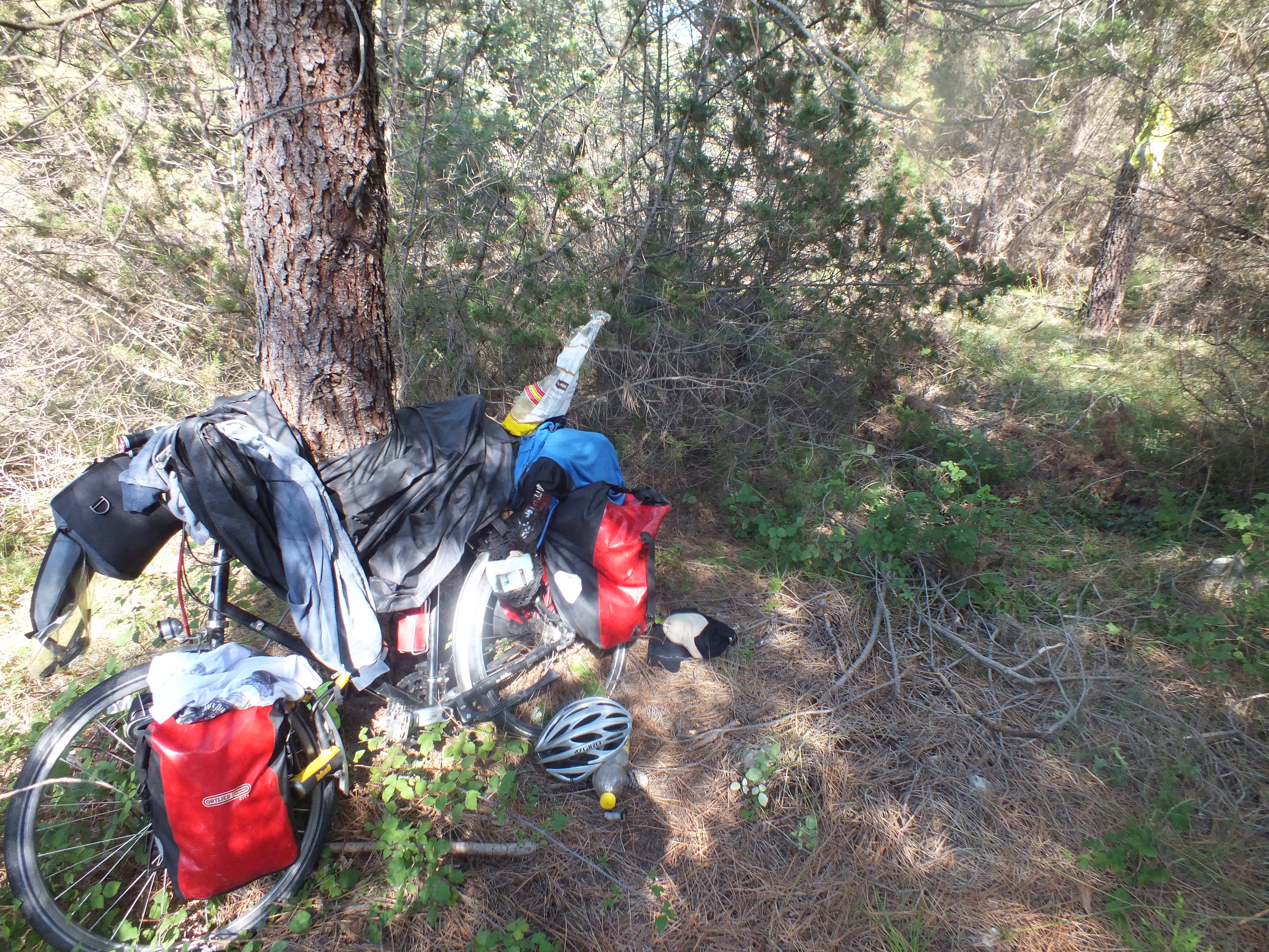 Within minutes I was soaked through, my sleeping bag was sodden and a pool was rapidly forming in the hammock. I jumped up and ran barefoot to the bike, cutting my feet on the sharp rocks as I ran. I grabbed the bike cover and dived back into the hammock, using the (once waterproof) cover to protect myself from the rain. There was nothing else I could do. I didn’t dare look at the time, afraid to find out how long I would have to endure the wet and the cold and the thunder roaring above me.