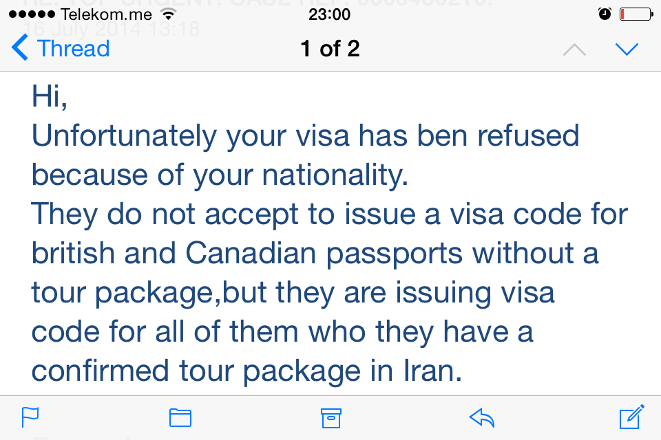 On two occasions now my application for a visa has been refused. I first applied via the online visa agent IranianVisa. Their website claims to be able to obtain a visa code (which is used to get a visa stamp at an embassy) for 96% of Brits within 7 – 10 days. Three months after I replied, whilst I was camping with the scouts in Montenegro, I received a message saying that my request had been denied because of my nationality.