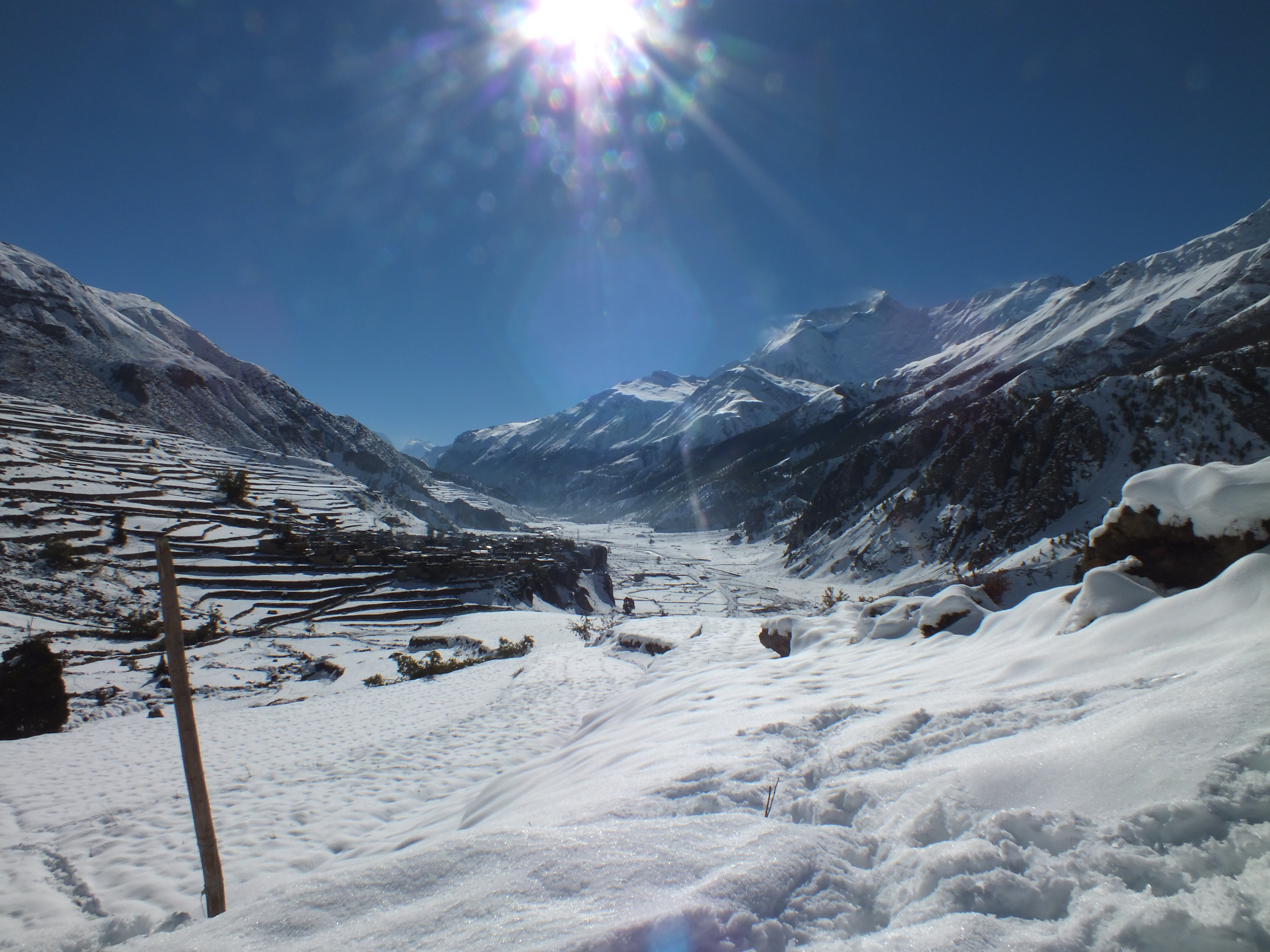 On the 14th October 2014 a snowstorm and series of avalanches occurred on and around Annapurna and the surrounding areas of the Himalayan range in Nepal. Rescue efforts saved the lives of over 400 people from the popular ‘Annapurna Circuit Trek’ and other treks in the area, however, despite these efforts, more than 40 people were killed and many are missing. Read Part 1 Here When I opened my eyes and looked out of the window on the morning of the 14th October I knew two things. I knew that overnight I had turned 24 years old, and I knew that Youn and I weren’t going anywhere. Outside the window heavy snow was falling and the world was already under a blanket almost two feet deep. Youn woke up, swore as he glanced out of the window and started to prepare his morning medicine. He also surprised me with a birthday preset, a newspaper wrapped bottle of rum which perfectly accompanied the bottle of whiskey that I had lugged from the start of the trek to toast my still being alive 24 years after birth.