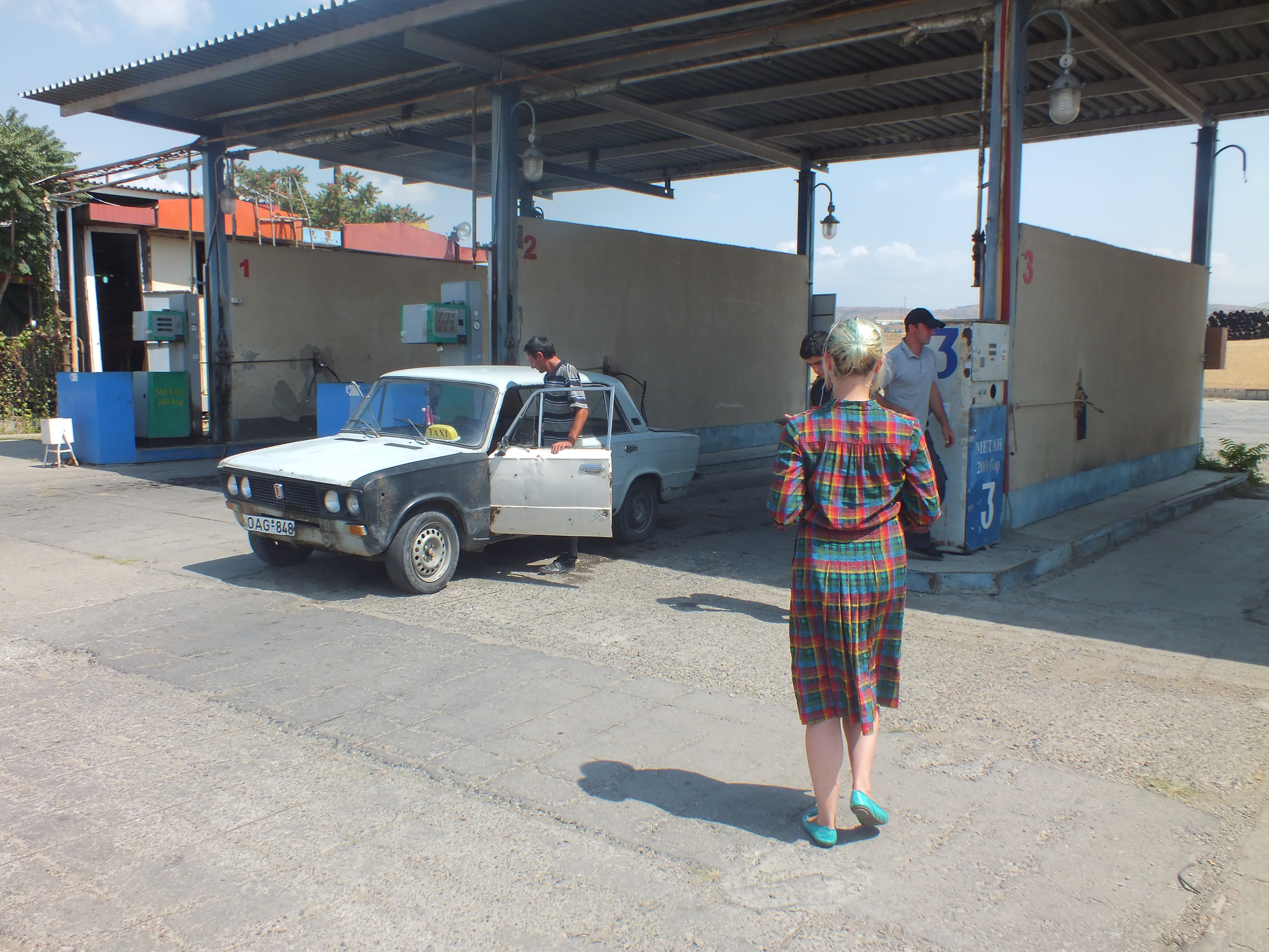 We were picked up by soon after but after just a few kilometers we were dropped off again. That was okay though, because the next car to pick us up was the car I had been hoping for. An ancient, rusty, black and white box of soviet history. A Zhiguli! It was stunning, the inside panels were missing from the doors and the windows were lowered with a handle passed to us from the glove-box. The steering column and dashboard were a marvelous tangle of coloured wires and the whole thing couldn’t go above 30kph. Now the huge smile on my face was genuine. The magic of the vehicle was made complete when we pulled into what looked like a car park. I was confused until I realised that we had stopped for gas. We all had to get out of the car and stand back as gas slowly filled the tank, and the inside of the car.