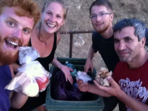 We quickly accepted that there was little or no chance of us getting back that night. Not without trekking 50km across the desert at night, which wasn’t really an option. We were going to have to spend the night. Our growling stomachs helped us focus on the more immediate issue, food. Between the eight of us we had a peach and about six slices of bread. I decided to go hunting for food with Jacek, a professional juggler from Poland. The monastery was silent, completely deserted but for the odd black-robed monk. The small shop was closed and looked like it only sold candles and trinkets anyway. I was feeling more and more certain that we were going to starve as we reached the bin and the small car park. I stopped. Desperate times call for desperate measures. I took a few steps towards the large green bin and peered inside. It was mostly filled with empty bottles but two large, purple plastic bags caught my eyes. Jacek could hardly believe it when I reached in, opened one of the bags and began rooting around inside it.