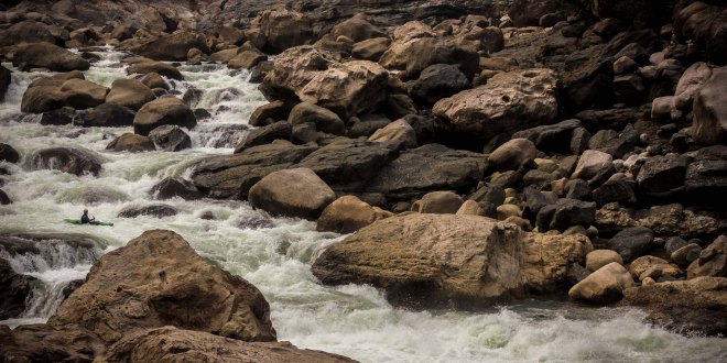 The Kynshi pushes south towards Bangladesh from the West Khasi Hills through some incredible scenery. Boulder strewn riverbanks give way to dense rainforest teaming with the buzz and chatter of a billion unseen creatures. Beyond these, the sheer walls of the gorges rise in steps reaching hundreds of meters and high in the perfectly clear sky, birds of huge sizes soar. Some Kayakers have found elephant dung along the riverbank but the elusive animals themselves remain, well, elusive. The boulders that line the banks and fill the river vary from the size of cars to the size of mansions and they form the features that make the Kynshi a paradise for Kayakers. Waterfalls over 30 feet high, world class rapids featuring waves, smaller drops and recirculating holes ready to catch any kayaker too slow to react, and, luckily for me, some nerve jangling, adrenaline pumping drops and shorter rapids with calm pools below them, perfect for my level of skill and experience. I was going to be pushed harder than I’ve ever been pushed before, but my friends were there to make sure I wasn’t pushed too far.